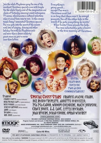 Pee-wee Herman and pals are celebrating Christmas in the Playhouse in their own creative ways: Pee-wee makes a list for Santa Claus 1 1/2 miles long, teaches Little Richard how to ice skate, goes for a sleigh ride with Magic Johnson, commands Frankie Avalon and Annette Funicello to make Christmas cards, receives a long phone call from Dinah Shore, even has more musical fun with k.d. lang, the Del Rubio Triplettes and Charo! Finally, Big Red arrives and announces that Pee-wee's Christmas list was so big, he didn't have enough presents for all the children of the world. Will Pee-wee follow his own advice and help others?