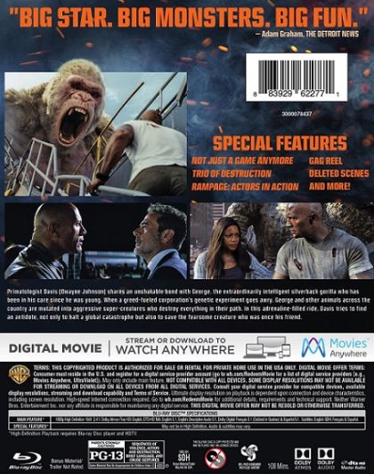 Primatologist Davis Okoye shares an unshakable bond with George, the extraordinarily intelligent, silverback gorilla who has been in his care since birth. But a rogue genetic experiment gone awry mutates this gentle ape into a raging creature of enormous size. To make matters worse, it’s soon discovered there are other similarly altered animals. As these newly created alpha predators tear across North America, destroying everything in their path, Okoye teams with a discredited genetic engineer to secure an antidote, fighting his way through an ever-changing battlefield, not only to halt a global catastrophe but to save the fearsome creature that was once his friend.