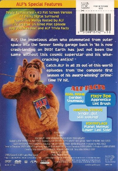 | Extras | Interactive Menus Hosted by ALF The Original Un-Aired Pilot Episode Gag/Outtakes Reel ALF Trivia Fac |
