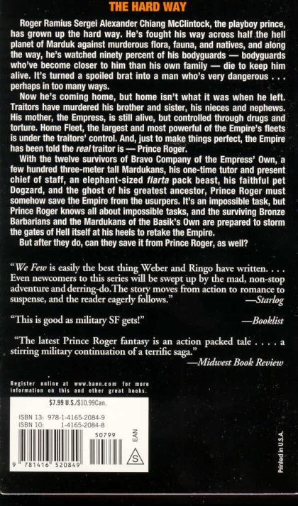 Prince Roger MacClintock was an heir to the galaxy's Throne of Man-and a self-obsessed spoiled young brat . . . until he and the Royal Marines sent to protect him were stranded on Marduk with only their feet to get them half way around the entire planet. So far, they've traversed a continent, crossed a sea full of ship-eating monsters, taken over an enemy spaceport, and hijacked a starship. But they're not home-free yet, because home is no longer free. In Roger's absence, a palace coup by enemies of the MacClintock family has seized control of the Empire. His mother the Empress is a captive in the palace and even in her own body, drugged so that her will is not her own. Roger's bother, the heir to the throne, is dead. And Roger himself has been branded an outlaw and traitor. Roger and his faithful band of human marines and native alien warriors have beaten the barbarian planet Marduk. Now they must re-conquer an interstellar empire. But they aren't about to give up, and with the help of those on the throne planet who are still loyal to the Empress they will infiltrate (under cover of a restaurant specializing in exotic Mardukan dishes, no less), they will make anyone who gets in their way (such as local mobsters who make the mistake of kidnapping Roger's fiancé) very sorry that they did, and they will not rest until the rightful ruler has been restored. Once again, a lot of power-hungry people are going to learn a hard lesson: You do not, ever, mess with a MacClintock! <P>