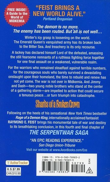 The demon is no more. The enemy has been routed. But all is not well . . . Winter's icy grasp is loosening on the world. The Emerald Queen's vanquished army has its broken back to the Bitter Sea. And treachery is its only recourse. A lackey has declared himself Lord of the defeated, amassing the still fearsome remnants of a ruthless fighting force together for one final assault on a weakened, vulnerable realm. For the warriors who remained steadfast against terrible numbers, for the courageous souls who barely survived a devastating onslaught upon their homeland, the time to rebuild and renew has not yet come. The war is not over in Midkemia. And Jimmy and Dash—two young noble brothers who stand at the center of a gathering storm—are impelled to action that could secure a tenuous peace . . . or turn triumph into catastrophe. The demon is no more. The enemy has been routed. But all is not well . . .