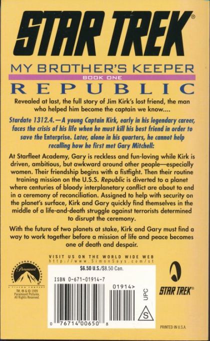 Revealed at last, the full story of Jim Kirk's lost friend, the man who helped him become the captain we know... Stardate 1312.4. -- A young Captain Kirk, early in his legendary career, faces the crisis of his life when he must kill his best friend in order to save the Enterprise. Later, alone in his quarters, be cannot help recalling how he first met Gary Mitchell: At Starfleet Academy, Gary is reckless and fun-loving while Kirk is driven, ambitious, but awkward around other people -- especially women. Their friendship begins with a fistfight. Then their routine training mission on the U.S.S. Republic is diverted to a planet where centuries of bloody interplanetary conflict are about to end in a ceremony of reconciliation. Assigned to help with security on the planet's surface, Kirk and Gary quickly find themselves in the middle of a life-and-death struggle against terrorists determined to disrupt the ceremony. With the future of two planets at stake, Kirk and Gary must find a way to work together before a mission of life and peace becomes one of death and despair.