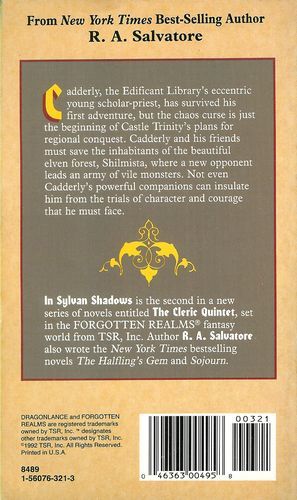 In sylvan shadows is the second novel in a new series (the cleric quintet, set in the forgotten realms tm fantasy world) involving a young scholar-priest Cadderly, who is cloistered away in an ancient library in the mountains. Trouble has spread from his home to a neighboring forest, where the resident elves are being slaughtered & their ruling prince placed in jeopardy. Cadderly must stop the onslaught, but even his powerful companions cannot shelter him from the trials he must face. Salvatore also wrote canticle, the first book in this series, as well as the ice wind dale trilogy & the dark elf trilogy. These include New York Times bestsellers the Crystal Shard & Sojurn respectively. He has a fast-paced, rollicking style that is immensely popular, but also presents extremely strong characters that the readers come to admire & respect.