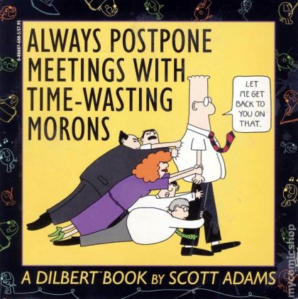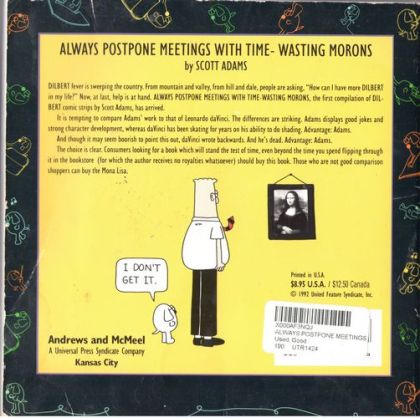 From mountain and valley, from hill and dale, people are asking, "How can I have more Dilbert in my life?" Help is at hand with a blast from the past in Scott Adams' very first compilation of Dilbert comic strips, Always Postpone Meetings with Time-Wasting Morons.It is tempting to compare Adams' work to that of Leonardo da Vinci. The differences are striking. Adams displays good jokes and strong character development, whereas da Vinci has been skating for years on his ability to do shading. Advantage: Adams.And though it may seem boorish to point this out, da Vinci wrote backwards. And he's dead. Advantage: Adams.The choice is clear. Fans looking for a book which will stand the test of time, even beyond the time you spend flipping through it in the bookstore (for which the author receives no royalties whatsoever), should buy this book. Those who are not good comparison shoppers can buy the Mona Lisa.