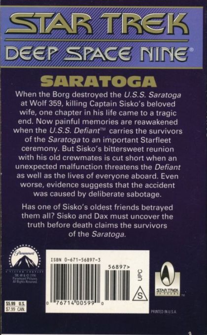 When the Borg destroyed the U.S.S. Saratoga at Wolf 359, killing Captain Sisko's beloved wife, one chapter in his life came to a tragic end. Now painful memories are reawakened when the U.S.S. DefiantTM carries the survivors of the Saratoga to an important Starfleet ceremony. But Sisko's bittersweet reunion with his old crewmates is cut short when an unexpected malfunction threatens the Defiant as well as the lives of everyone aboard. Even worse, evidence suggests that the accident was caused by deliberate sabotage. Has one of Sisko's oldest friends betrayed them all? Sisko and Dax must uncover the truth before death claims the survivors of the Saratoga.