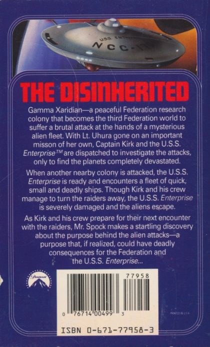 The Disinherited Gamma Xaridian--a peaceful Federation research colony that becomes the third Federation world to suffer a brutal attack athe handsof a mysterious alien fleet. With Lt. Uhura gone on an important mission of her own, Captain Kirk and the U.S.S. "Enterprise(TM) " are dispatched to investigate the attacks, only to find the planets completely devastated. When another nearby colony is attacked, the U.S.S. "Enterprise" is ready and encounters a fleet of quick, small and deadly ships. Though Kirk and his crew manage to turn the raiders away, the U.S.S, "Enterprise" is severly damaged and the aliens escape. As Kirk and his crew prepare for their next encounter with the raiders, Mr. Spock makes a startling discovery about the purpose behind the alien attacks -- a purpose that, if realized, could have deadly consequences for the Federation and the U.S.S "Enterprise..."