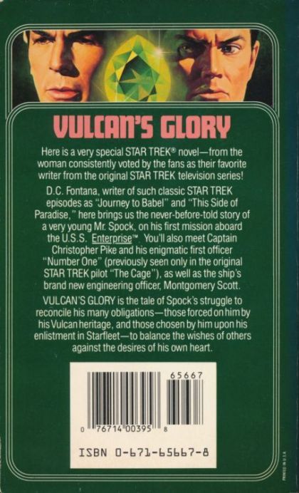 Here is a very special STAR TREK(R) novel -- from the woman consistently voted by the fans as their favorite writer from the original STAR TREK television series! D.C. Fontana, writer of such classic STAR TREK episodes as Journey to Babel and This Side of Paradise, here brings us the never-before-told story of a very young Mr. Spock, on his first mission aboard the U.S.S. Enterprise. You'll also meet Captain Christopher Pike and his enigmatic first officer Number One (previously seen only in the original STAR TREK pilot The Cage), as well as the ship's brand new engineering officer, Montgomery Scott. Vulcan's Glory is the tale of Spock's struggle to reconcile his many obligations -- those forced on him by his Vulcan heritage, and those chosen by him upon his enlistment in Starfleet -- to balance the wishes of others against the desires of his own heart.