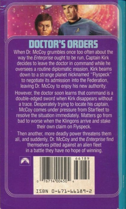 Doctor's Orders When Dr. McCoy grumbles once too often about the way the U.S.S. Enterprise? ought to be run, Captain Kirk decides to leave the doctor in command while he oversees a rountine diplomatic mission. Kirk beams down to a strange planet nicknamed "Flyspeck" to negotiate its admission into the Federation, leaving Dr. McCoy to enjoy his new authority. However, the doctor soon learns that command is a double-edged sword when Kirk disappears without a trace. Desperately trying to locate his catain, McCoy comes under pressure from Starfleet to resolve the situation immediately. Matters go from bad to worsewhen the Klingons arrive and stake their own claim on Flyspeck Then another, more deadly power threatens them all, and suddenly Dr. McCoy and the Starship Enterprise find themselves pitted against an alien fleet in a battle they have no hope of winning.