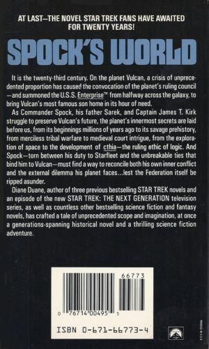 It is the twenty-third century. On the planet Vulcan, a crisis of unprecedented proportion has caused the convocation of the planet's ruling council -- and summoned the "U.S.S. Enterprise(TM) " from halfway across the galaxy, to bring Vulcan's most famous son home in its hour of need. As Commander Spock, his father Sarek, and Captain James T. Kirk struggle to preserve Vulcan's future, the planet's innermost secrets are laid before us, from its beginnings millions of years ago to its savage prehistory, from merciless tribal warfare to medieval court intrigue, from the exploration of space to the the development of o'thia -- the ruling ethic of logic. And Spock -- torn between his duty to Starfleet and the unbreakable ties that bind him to Vulcan -- must find a way to reconcile both his own inner conflict and the external dilemma his planet faces...lest the Federation itself be ripped asunder. Diane Duane, author of three previous bestselling STAR TREK novels and an episode of the new STAR TREK NEXT GENERATION(R) television series, as well as countless other bestselling science fiction and fantasy novels, has crafted a tale of unprecedented scope and imagination, at once a generations-spanning historical novel and a thrilling science fiction adventure.