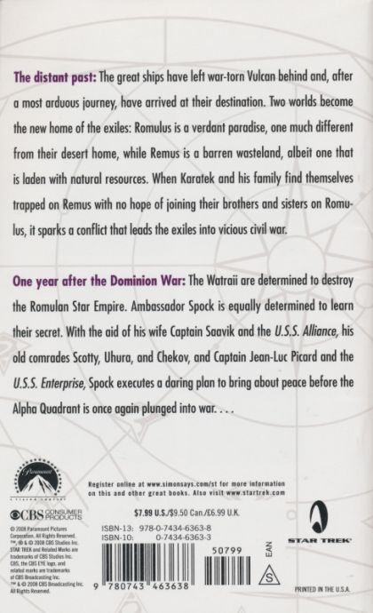 Following their bestsellers Vulcan's Forge and Vulcan's Heart, Josepha Sherman and Susan Shwartz conclude their new trilogy chronicling the latter-day adventures of one of Star Trek's most beloved characters, shedding new light on his world's shocking history. The distant past: The great ships have left war-torn Vulcan behind and, after a most arduous journey, have arrived at their destination. Two worlds become the new home of the exiles: Romulus is a verdant paradise, one much different from their desert home, while Remus is a barren wasteland, albeit one that is laden with natural resources. When Karatek and his family find themselves trapped on Remus with no hope of joining their brothers and sisters on Romulus, it sparks a conflict that leads the exiles into vicious civil war. One year after the Dominion War: The Watraii are determined to destroy the Romulan Star Empire. Ambassador Spock is equally determined to learn their secret. With the aid of his wife Captain Saavik and the U.S.S. Alliance, his old comrades Scotty, Uhura, and Chekov, and Captain Jean-Luc Picard and the U.S.S. Enterprise, Spock executes a daring plan to bring about peace before the Alpha Quadrant is once again plunged into war.... The stunning conclusion to the trilogy that changes everything you thought you knew about the Vulcans and the Romulans!
