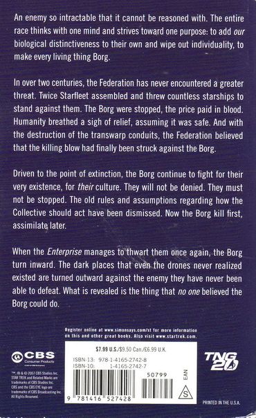 An enemy so intractable that it cannot be reasoned with. The entire race thinks with one mind and strives toward one purpose: to add our biological distinctiveness to their own and wipe out individuality, to make every living thing Borg. In over two centuries, the Federation has never encountered a greater threat. Twice Starfleet assembled and threw countless starships to stand against them. The Borg were stopped, the price paid in blood. Humanity breathed a sigh of relief, assuming it was safe. And with the destruction of the transwarp conduits, the Federation believed that the killing blow had finally been struck against the Borg. Driven to the point of extinction, the Borg continue to fight for their very existence, for their culture. They will not be denied. They must not be stopped. The old rules and assumptions regarding how the Collective should act have been dismissed. Now the Borg kill first, assimilate later. When the Enterprise manages to thwart them once again, the Borg turn inward. The dark places that even the drones never realized existed are turned outward against the enemy they have never been able to defeat. What is revealed is the thing that no one believed the Borg could do.