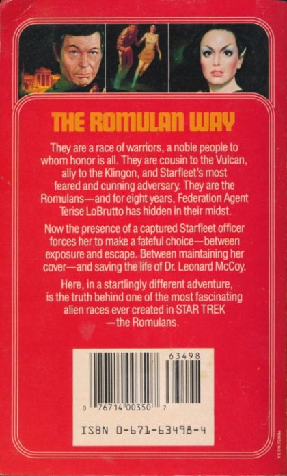 They are a race of warriors, a noble people to whom honor is all. They are cousin to the Vulcan, ally to the Klingon, and Starfleet's most feared and cunning adversary. They are the Romulans -- and for eight years, Federation Agent Terise LoBrutto has hidden in their midst. Now the presence of a captured Starfleet officer forces her to make a fateful choice -- between exposure and escape. Between maintaining her cover -- and saving the life of Dr. Leonard McCoy. Here, in a startlingly different adventure, is the truth behind one of the most fascinating alien races ever created in STAR TREK -- the Romulans.