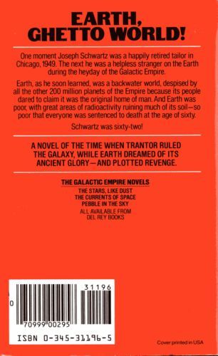 One moment Joseph Schwartz is a happily retired tailor in Chicago, 1949. The next he's a helpless stranger on Earth during the heyday of the first Galactic Empire. Earth, as he soon learns, is a backwater, just a pebble in the sky, despised by all the other 200 million planets of the Empire because its people dare to claim it's the original home of man. And Earth is poor, with great areas of radioactivity ruining much of its soil--so poor that everyone is sentenced to death at the age of sixty. Joseph Schwartz is sixty-two. This is young Isaac Asimov's first novel, full of wonders and ideas, the book that launched the novels of the Galactic Empire, culminating in the Foundation series. This is Golden Age SF at its finest.