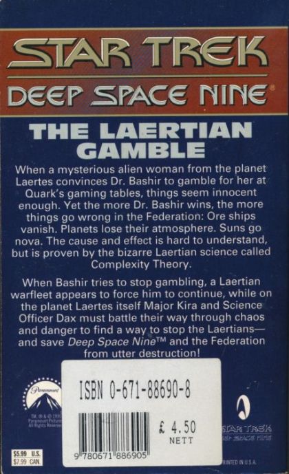 When a mysterious alien woman from the planet Laertes convinces Dr. Bashir to gamble for her at Quark's gaming tables, things seem innocent enough. Yet the more Dr. Bashir wins, the more things go wrong in the Federation: Ore ships vanish. Planets lose their atmosphere. Suns go nova. The cause and effect is hard to understand, but is proven by the bizarre Laertian science called Complexity Theory. When Bashir tries to stop gambling, a Laertian warfleet appears to force him to continue, while on the planet Laertes itself Major Kira and Science Officer Dax must battle their way through chaos and danger to find a way to stop the Laertians -- and save "Deep Space Nine"(TM) and the Federation from utter destruction!