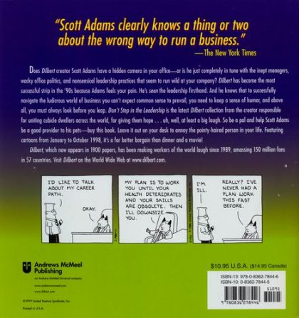 "For the armies of American office workers, Dilbert is a reminder that they are not alone."--Chicago Tribune"Cruel and incompetent bosses, plus the pervasive stupidity of people Adams calls 'in-duh-viduals,' are favorite targets in the strip, which appears...on the Internet, in best-selling books, and on refrigerator magnets, coffee mugs, desk calendars, software, neckties, and even underwear."--Playboy magazineDoes Dilbert creator Scott Adams have a hidden camera in your office--or is he just completely in tune with the inept managers, wacky office politics, and nonsensical leadership practices that seem to run wild at your company?Stop looking for the camera. Dilbert has become a hugely successful strip because Adams feels your pain. How? Because this former employee of a major telecommunications company has been there. He's seen the leadership firsthand. And he knows that to successfully navigate the ludicrous world of business, you can't expect common sense to prevail, you need to keep a sense of humor, and above all, you must always look before you leap.The strip's enormous popularity stems from the fact that its millions of readers easily identify with the crazy plots and wacky characters found within the corporate environment of collections like this one, Don't Step on the Leadership. Sure, most companies don't have a bespectacled engineer with a tie permanently curled up, a cynical talking dog, and a manager with two pointy tufts of hair. But it's the outrageous things Dilbert characters do and say that leave readers knowingly nodding their heads and, of course, laughing uproariously. The antics of Dilbert's cast are based not only on Adams' own corporate experiences, but on the more than 300 e-mails he receives each day about the office dramas of his devoted fans.