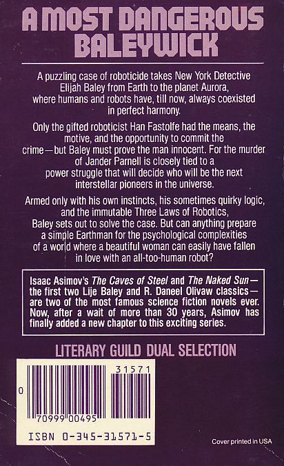 Called to the Spacer world to solve a case of roboticide, New York City detective Elijah Baley teams up with humanoid robot R. Daneel Olivaw. Together they are tasked with proving that the prime suspect, a renowned roboticist, is innocent of the crime. Plain clothes man Elijah Baley must travel to the planet Aurora to investigate the murder of Robot Jander. He would rather not. His last trip off-Earth on police business resulted in a TV drama being made of the case - as a result of which even his son Bentley suspects Elijah had an affair with Gladia Delmarre, the murder suspect whom he proved innocent. Not only does Gladia now live on Aurora, the murdered robot belonged to her ... and was her lover! Elijah is teamed once more with Robot Daneel, and they are joined by another interesting robot, Giskard. The investigation should benefit from a secret and unique ability possessed by Robot Giskard. But Elijah is disturbed by his presence, sensing perhaps that Giskard's positronic brainpaths function to a hidden agenda. What Giskard knows but Elijah does not is that the future of mankind in space hangs on the outcome of this investigation ...