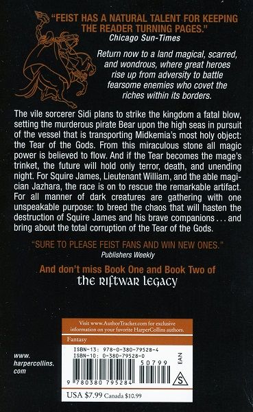 The vile sorcerer Sidi plans to strike the kingdom a fatal blow, setting the murderous pirate Bear upon the high seas in pursuit of the vessel that is transporting Midkemia's most holy object; the Tear of the Gods. From this miraculous stone all magic power is believed to flow. And if the Tear becomes the mage's trinket, the future will hold only terror, death and unending night. For Squire James, Lieutenant William, and the able magician Jazhara, the race is on to rescue the remarkable artifact. For all manner of dark creatures are gathering with one unspeakable purpose: to breed the chaos that will hasten the destruction of Squire James and his brave companions . . . and bring about the total corruption of the Tear of the Gods.