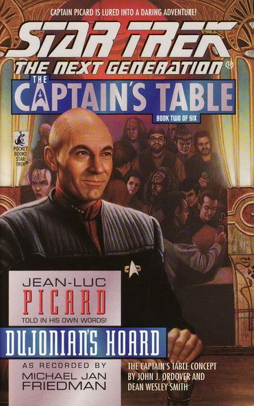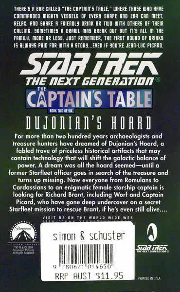 There's a bar called "The Captain's Table," where those who have commanded mighty vessels of every shape and era can meet, relax, and share a friendly drink or two with others of their calling. Sometimes a brawl may break out but it's all in the family, more or less. Just remember, the first round of drinks is always paid for with a story...even if you're Jean-Luc Picard. For more than two hundred years archaeologists and treasure hunters have dreamed of Dujonian's Hoard, a fabled trove of priceless historical artifacts that may contain technology that will shift the galactic balance of power. A dream was all the hoard seemed -- until a former Starfleet officer goes in search of the treasure and turns up missing. Now everyone from Romulans to Cardassians to an enigmatic female starship captain is looking for Richard Brant, including Worf and Captain Picard, who have gone deep undercover on a secret Starfleet mission to rescue Brant, if he's even still alive....