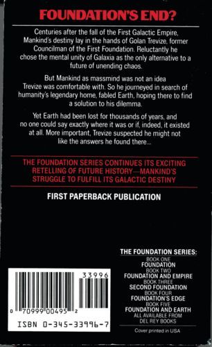 The fifth novel in Asimov's popular Foundation series opens with second thoughts. Councilman Golan Trevize is wondering if he was right to choose a collective mind as the best possible future for humanity over the anarchy of contentious individuals, nations and planets. To test his conclusion, he decides he must know the past and goes in search of legendary Earth, all references to which have been erased from galactic libraries. The societies encountered along the way become arguing points in a book-long colloquy about man's fate, conducted by Trevize and traveling companion Bliss, who is part of the first world/mind, Gaia.