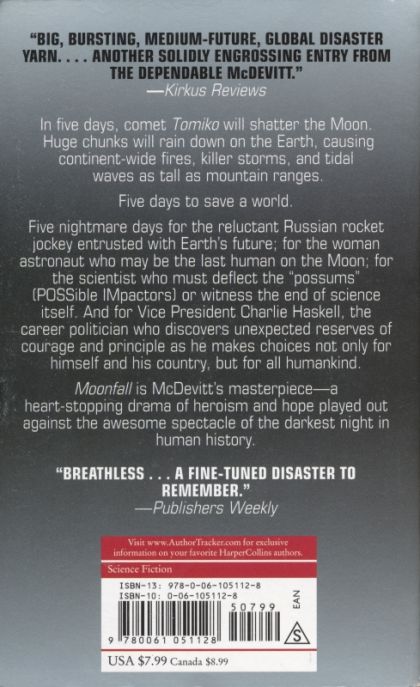 It's the 21st century, and all is right with the world. Or so it seems. Vice President Charlie Haskell, who will travel anywhere for a photo op, is about to cut the ribbon for the just-completed American Moonbase. The first Mars voyage is about to leave high orbit, with a woman at the helm. Below, the world is marveling at a rare solar eclipse. But all that is right is about to go disastrously wrong when an amateur astronomer discovers a new comet. Named for its discover, Tomikois a "sun-grazer,"an interstellar wanderer with a hundred times the mass and ten times the speed of other comets. And it is headed straight for our moon. In less than five days, if scientists' predictions are right, Tomiko will crash into the moon, shattering it into a cloud of superheated gas, dust, and huge chunks of rock that will rain down on the earth, causing chaos and killer storms, possibly tidal waves inundating entire cities...or worse: a single apocalyptic worldwide "extinction event." In the meantime, the population of Moonbase must be evacuated by a hastily assembled fleet of shuttle rockets. There isn't room, or time enough, for everyone. And the vice president, who rashly promised to be last off ("I will lock the door and turn off the lights"), is trying to figure out how to get away without eating his words. In Moonfall,McDevitt has created a disaster thriller of truly epic proportions, featuring a cast of unforgettable characters: the reluctant Russian rocket jockey entrusted with the lives of squabbling refugees; the woman chosen to be first on the moon; the scientist who must deflect the "possum" (POSSible IMpactors) knocked from orbit or witness the end science itself. And at the center of it all is Charlie Haskell, the career politician who discovers his own unexpected reserves of only himself and his country, but for all humankind. Moonfall,is a spellbinding tale of heroism and hope, cowardice and passion played against the awesome spectacle of human history's darkest night.