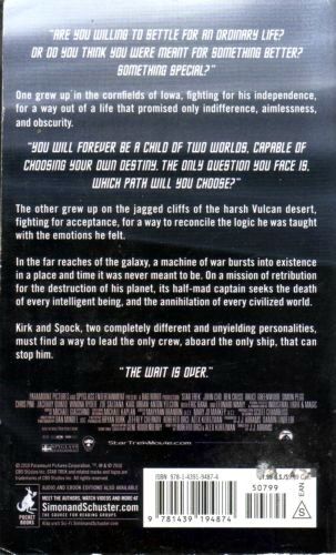 The New York Times bestselling novelization of J.J. Abrams’s blockbuster Star Trek movie explores the origins of James T. Kirk, Spock, and the crew of the USS Enterprise.One grew up in the cornfields of Iowa, fighting for his independence, for a way out of a life that promised only indifference, aimlessness, and obscurity. The other grew up on the jagged cliffs of the harsh Vulcan desert, fighting for acceptance, for a way to reconcile the logic he was taught with the emotions he felt. In the far reaches of the galaxy, a machine of war bursts into existence in a place and time it was never meant to be. On a mission of retribution for the destruction of his planet, its half-mad captain seeks the death of every intelligent being, and the annihilation of every civilized world. Kirk and Spock, two completely different and unyielding personalities, must find a way to lead the only crew, aboard the only ship, that can stop him.
