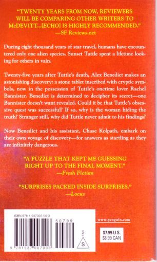 A new novel of the fantastic unknown by the national bestselling author of "Time Travelers Never Die." Eccentric Sunset Tuttle spent his life searching in vain for forms of alien life. Thirty years after his death, a stone tablet inscribed with cryptic, indecipherable symbols is found in the possession of Tuttle's onetime lover, and antiquities dealer Alex Benedict is anxious to discover what secret the tablet holds. It could be proof that Tuttle had found what he was looking for. To find out, Benedict and his assistant embark on their own voyage of discovery-one that will lead them directly into the path of a very determined assassin who doesn't want those secrets revealed.