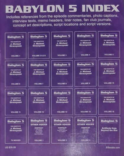 QUICK GLANCE AT WHAT'S INCLUDED 400 page two-sided softcover book Side 1: ENCOUNTERS WITH J. MICHAEL STRACZYNSKI: Landmark interviews with JMS plus B5 analysis written by JMS Side 2: Babylon 5 Index covering all 20 B5 Script Books and ARTIFACTS FROM BEYOND THE RIM Tête-bêche style binding - Get Two Books in One Courtesy Data Reference Disc (First 7 days only) Choice of Centauri Purple or Station Blue (7 days only)