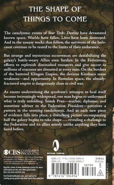 The Shape of Things to Come The cataclysmic events of Star Trek: Destiny have devastated known space. Worlds have fallen. Lives have been destroyed. And in the uneasy weeks that follow, the survivors of the holocaust continue to be tested to the limits of their endurance. But strange and mysterious occurrences are destabilizing the galaxy's battle-weary Allies even further. In the Federation, efforts to replenish diminished resources and give succor to millions of evacuees are thwarted at every turn. On the borders of the battered Klingon Empire, the devious Kinshaya sense weakness -- and opportunity. In Romulan space, the already-fractured empire is dangerously close to civil war. As events undermining the quadrant's attempts to heal itself become increasingly widespread, one man begins to understand what is truly unfolding. Sonek Pran -- teacher, diplomat, and sometime adviser to the Federation President -- perceives a pattern in the seeming randomness. And as each new piece of evidence falls into place, a disturbing picture encompassing half the galaxy begins to take shape...revealing a challenge to the Federation and its allies utterly unlike anything they have faced before.