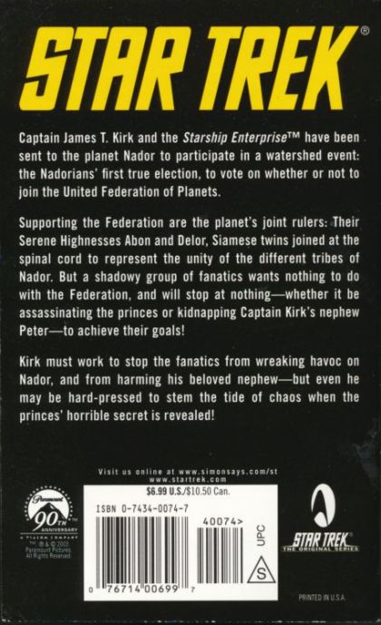 Captain James T. Kirk and Dr. McCoy must stretch themselves to the limit as assassination attempts threaten the war-ravaged world of Nador's fragile hope of peace. The starship Enterprise is assigned to attend the ceremony that will unite a world. The focus of the ceremony is a pair of Siamese Twins named Abon and Delor who represent the united factions of the planet Nador. Disaster strikes when assassination attempts are made against the twins, who embody the hopes and dreams of the formerly war-torn planet's entire population. Captain James T. Kirk must root out the assassins from whatever hiding places they are striking from - whether they be hidden in deep places or even in plain sight. Meanwhile, Dr. McCoy must perform a radical surgical procedure in a desperate attempt to save Abon and Delor's lives.