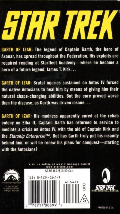 The return of a great villain -- and former hero. Once a Starfleet legend, Captain Garth lost his mind, and with it his reputation. Now supposedly cured, Garth must build a new life in a universe that worships his memory but no longer trusts him. Captain Garth of Izar, hero of the battle of Axanar which helped secure the future of the Federation, was once a legendary Starfleet Captain whose exploits were required reading at Starfleet Academy. In the 2260s he suffered serious injuries in an incident on Antos IV. The inhabitants of Antos repaired his body by teaching him the art of cellular metamorphosis, but did not realise that his injuries had rendered him criminally insane. After ordering the destruction of Antos IV, Garth was committed to the Federation rehab colony on Elba II, where, in 2268, he overpowered his keepers, escaping with the aid of the cellular-metamorphosis process, mastery of which enabled him to take on the appearance of any person he wished. Before his eventual recapture he had proclaimed himself lord of the universe and attempted to commandeer the Starship Enterprise. Now cured of his insanity by new techniques of experimental medicine, Garth of Izar must rebu