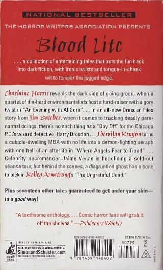 The Horror Writers Association PresentsBLOOD LITE...a collection of entertaining tales that puts the fun back into dark fiction, with ironic twists and tongue-in-cheek wit to temper the jagged edge.Charlaine Harris reveals the dark side of going green, when a quartet of die-hard environmentalists hosts a fundraiser with a gory twist in "An Evening with Al Gore"...In an all-new Dresden Files story from Jim Butcher, when it comes to tracking deadly paranormal doings, there's no such thing as a "Day Off" for the Chicago P.D.'s wizard detective, Harry Dresden...Sherrilyn Kenyon turns a cubicle-dwelling MBA with no life into a demon-fighting seraph with one hell of an afterlife in "Where Angels Fear to Tread"...Celebrity necromancer Jaime Vegas is headlining a sold-out séance tour, but behind the scenes, a disgruntled ghost has a bone to pick, in Kelley Armstrong's "The Ungrateful Dead." Plus tales guaranteed to get under your skin -- in a good way -- fromJanet Berliner Don D'Ammassa Nancy Holder Nancy KilpatrickJ. A. Konrath and F. Paul Wilson Joe R. Lansdale Will LudwigsenSharyn McCrumb Mark Onspaugh Mike Resnick Steven SavileD. L. Snell Eric James Stone Jeff Strand Lucien Soulban Matt Venne Christopher WelchSo let the blood flow and laughter reign -- because when it comes to facing our deepest, darkest fears, a little humor goes a long way!