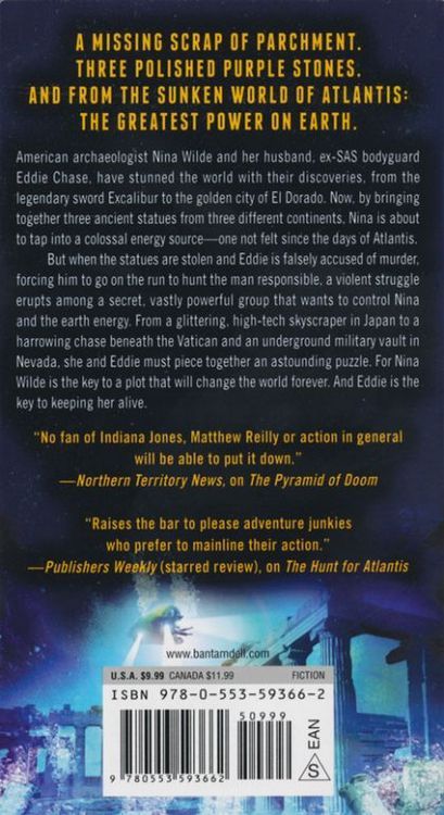 A missing scrap of parchment. Three polished purple stones. And from the sunken world of Atlantis: the greatest power on Earth. American archaeologist Nina Wilde and her husban, ex-SAS bodyguard Eddie Chase, have stunned the world with their discoveries, from the legendary sword Excalibur to the golden city of El Dorado. Now, by bringing together three ancient statues from three different continents, Nina is about to tap into a colossal energy surce -- one not felt since the days of Atlantis. But when the statues are stolen and Eddie is falsely accused of murder, forcing him to go n the run to hunt the man responsible, a violent struggle erupts among a secret, vastly powerful group that wants to control Nina and the earth energy. From a glittering, high-tech skyscraper in Japan to a harrowing chase beneath the Vatican and an underground military vault in Nevada, she and Eddie must piece together an astounding puzzle. For Nina Wilde is the key to a plot that will change the world forever. And Eddie is the key to keeping her alive.