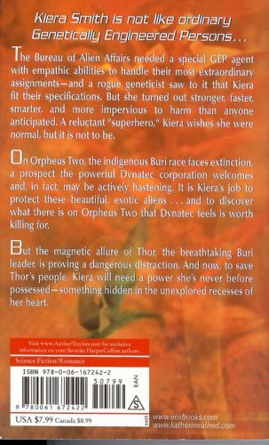 Kiera Smith is not like ordinary Genetically Engineered Persons . . . The Bureau of Alien Affairs needed a special GEP agent with empathic abilities to handle their most extraordinary assignments—and a rogue geneticist saw to it that Kiera fit their specifications. But she turned out stronger, faster, smarter, and more impervious to harm than anyone anticipated. A reluctant "superhero," Kiera wishes she were normal, but it is not to be. On Orpheus Two, the indigenous Buri race faces extinction, a prospect the powerful Dynatec corporation welcomes and, in fact, may be actively hastening. It is Kiera's job to protect these beautiful, exotic aliens . . . and to discover what there is on Orpheus Two that Dynatec feels is worth killing for. But the magnetic allure of Thor, the breathtaking Buri leader, is proving a dangerous distraction. And now, to save Thor's people, Kiera will need a power she's never before possessed—something hidden in the unexplored recesses of her heart.
