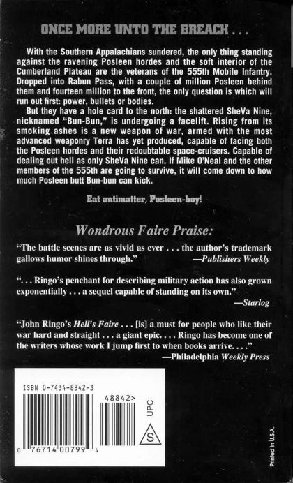 With the defenses of the Southern Appalachians sundered, the only thing standing between the ravening Posleen hordes and the soft interior of the Cumberland Plateau are the veterans of 555th Mobile Infantry. Dropped into Rabun Pass, with a couple of million Posleen behind them and fourteen million to the front, the only question is which will run out first: power, bullets or bodies. But they have a hole card: far to the north the shattered SheVa Nine is undergoing a facelift. Rising from its smoking ashes is a new weapon of war, armed with the most advanced weaponry Terra has ever produced, capable of facing both the Posleen hordes and their redoubtable space-cruisers. Capable of dealing out hell as only SheVa Nine can. If Mike O'Neal and the other members of the 555th are going to survive, it will come down to how much Posleen butt Bun-bun can kick. <I>Prepare to eat antimatter</i>, Posleen-boy.<P>