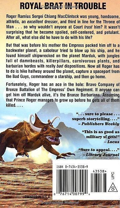 "Roger Ramius Sergei Chiang MacClintock didn't understand." "He was young, handsome, athletic, an excellent dresser, and third in line for the Throne of Man ... so why wouldn't anyone at Court trust him?" "Why wouldn't even his own mother, the Empress, explain why they didn't trust him? Or why the very mention of his father's name was forbidden at Court? Or why his mother had decided to pack him off to a backwater planet aboard what was little more than a tramp freighter to represent her at a local political event better suited to a third assistant undersecretary of state?" "It probably wasn't too surprising that someone in his position should react by becoming spoiled, self-centered and petulant. After all, what else did he have to do with his life?" "But that was before a saboteur tried to blow up his transport. Then warships of the Empire of Man's worst rivals shot the crippled vessel out of space. Then Roger found himself shipwrecked on the planet Marduk, whose jungles were full of damnbeasts, killerpillars, carnivorous plants, torrential rain, and barbarian hordes with really bad dispositions. Now all Roger has to do is hike halfway around the entire planet, then capture a spaceport from the Bad Guys, somehow commandeer a starship, and then go home to Mother for explanations." "Fortunately, Roger has an ace in the hole: Bravo Company of Bronze Battalion of The Empress' Own Regiment. If anyone can get him off Marduk alive, it's the Bronze Barbarians." "Assuming that Prince Roger manages to grow up before he gets all of them killed."--BOOK JACKET.