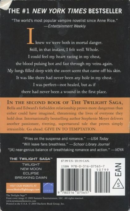 The #1 New York Times bestseller is available for the first time in a mass market paperback edition, featuring a striking movie tie-in cover. In New Moon, Stephenie Meyer delivers another irresistible combination of romance and suspense with a supernatural twist. The "star-crossed" lovers theme continues as Bella and Edward find themselves facing new obstacles, including a devastating separation, the mysterious appearance of dangerous wolves roaming the forest in Forks, a terrifying threat of revenge from a female vampire and a deliciously sinister encounter with Italy's reigning royal family of vampires, the Volturi. Passionate, riveting, and full of surprising twists and turns, this vampire love saga captures the struggle between defying our instincts and satisfying our desires. This is a love story with bite.