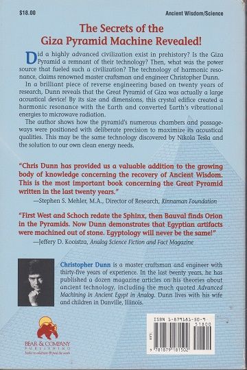 Did a highly advanced civilization exist in prehistory? Is the Giza Pyramid a remnant of their technology? Then, what was the power source that fueled such a civilization? The technology of harmonic resonance, claims renowned master craftsman and engineer Christopher Dunn. In a brilliant piece of reverse engineering based on twenty years of research, Dunn reveals that the Great Pyramid of Giza was actually a large acoustical device! By its size and dimensions, this crystal edifice created a harmonic resonance with the Earth and converted Earth's vibrational energies to microwave radiation. The author shows how the pyramid's numerous chambers and passageways were positioned with the deliberate precision to maximize its acoustical qualities. This may be the same technology discovered by Nikola Tesla and the solution to our own clean energy needs.