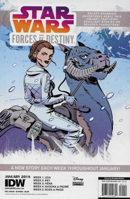 The Star Wars Forces of Destiny initiative celebrates the inspiring stories of iconic heroes from a galaxy far, far away.... Star Wars Adventures has joined the festivities with an exciting weekly series of comic books that explores all corners of the Star Wars universe, showing how choices both big and small ultimately shape the destinies of beloved characters, such as Princess Leia, Rey, Padme, Ahsoka, and Hera along with your soon-to-be favorites from The Last Jedi, Rose and Paige! Fans will be excited to discover these stories told by talent from across Star Wars novels, comics and animation, including Delilah S. Dawson, Elsa Charretier, Beth Revis, Jody Houser, and Devin Grayson! • Each issue has a variant cover by Elsa Charretier! Collect all five! • Featuring your favorite classic Star Wars characters and a couple of brand new favorites!