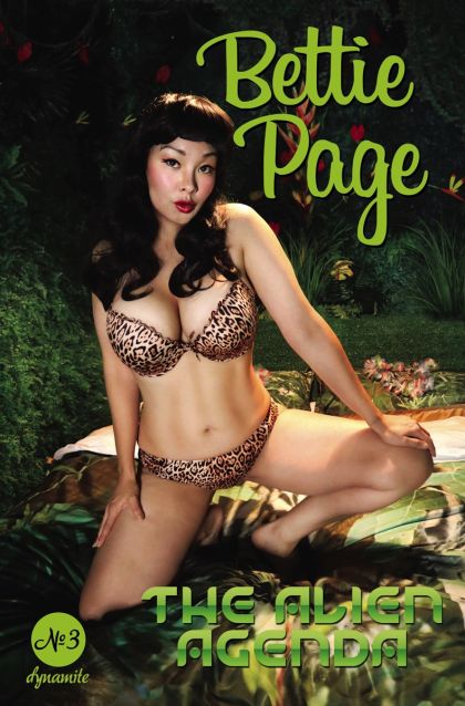 Celebrate the timeless, pinup beauty of Ms. Bettie Page with a risqué photo cover of Dynamite's new Bettie Page #3: Alien Agenda! The same great story inside a more scintillating cover, inside a black bag!