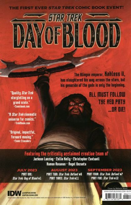 The crossover event between Star Trek and Star Trek: Defiant continues here in part two of Day of Blood! Worf and Sisko begin their trek to Kahless' spire to stop the false prophet's siege of Qo'noS with each other being the last man either wants to rely on. Meanwhile, Spock takes the bridge of the Theseus, reuniting with his old friend Captain Montgomery Scott and desperately attempting to keep the Red Path's Bloodwings at bay. Rated T