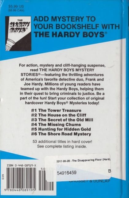 Once again Frank and Joe Hardy take on a puzzling case when their famous detective father asks the boys to assist him in tracking down a notorious jewel thief and his accomplices. The trail leads to the outskirts of the Hardys’ home town and to a weirdly guarded mansion on the old Perth estate. With their pal Chet Morton, the brothers must tackle the mystery of the mansion heir’s sudden death. A disappearing floor, a huge, savage-looking, hound, a galloping ghost, and a college professor’s startling invention are just a few of the strange elements that complicate the boys’ efforts to solve both mysteries.