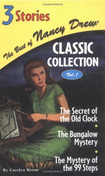 #1: The Secret of the Old Clock Nancy, unaided, seeks to find a missing will. To the surprise of many, the Topham family will inherit wealthy Josiah Crowley's fortune, instead of deserving relatives and friends who were promised inheritances. Nancy determines that a clue to a second will might be found in an old clock Mr. Crowley had owned and she seeks to find the timepiece. Her search not only tests her keen mind, but also leads her into a thrilling adventure. Original vs. Revision: This is the revised text from the 1930 original book. The plot is the same with minor revisions. The Turner sisters (Edna and Matilda now Mary) are guardians of a great-niece. Allison Hoover (formerly Allie Horner) wants to become an operatic singer instead of a chicken farmer. Grace Horner is Grace Hoover. Miss Abigail Rowen is Mrs. Abby Rowen. Jeff Tucker is a tall, thin white man, and not as an intoxicated black man. Mrs. Topham’s first name is not given. #3: The Bungalow Mystery Nancy and Helen Corning are trapped in a violent lake storm and rescued by young orphan, Laura Pendleton. Upon meeting Laura's guardian, Jacob Aborn, the girls are disturbed by Mr. Aborn's odd and crass behaviors. Soon Laura confides in Nancy about Mr. Aborn's mistreatment toward her. While trying to help Laura, Nancy has a perilous experience in and around a deserted bungalow at the hands of a crafty villain. Original vs. Revision: This is the revised text from the 1930 original book. The plot is the same with minor revisions. Jacob Aborn (Marian) and Stumpy Dowd (Alma) acquire wives. There is a sub-plot about securities fraud. #43: The Mystery of the 99 Steps Nancy, Bess and George travel to France to search for a flight of 99 steps to solve the mystery of a friend's strange dream. During her quest, Nancy encounters a sinister villain known as Monsieur Neuf! Additionally, while in France, Nancy and her father investigate a wealthy financier who has been frightened into selling large amounts of securities.