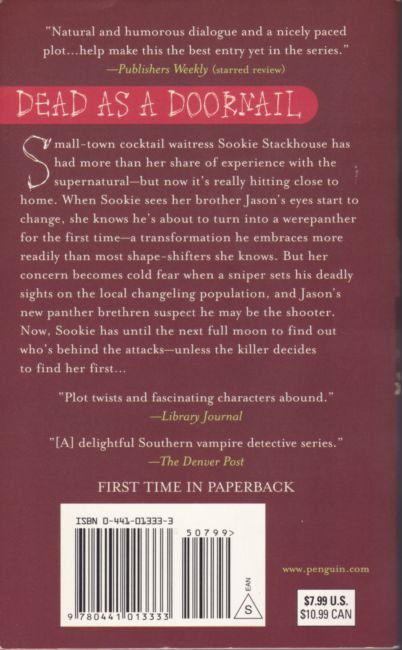 Small town cocktail waitress Sookie Stackhouse’s supernatural existence puts her in the line of fire in the fifth novel in the #1 New York Times bestselling series—the inspiration for the HBO® original series True Blood.When Sookie Stackhouse sees her brother Jason’s eyes start to change, she knows he’s about to turn into a were-panther for the first time. But her concern becomes cold fear when a sniper sets his deadly sights on the local changeling population, and Jason’s new panther brethren suspect he may be the shooter. Now, Sookie has until the next full moon to find out who’s behind the attacks—unless the killer decides to find her first...
