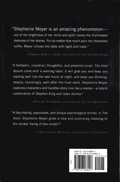 The author of the Twilight series of #1 bestsellers delivers her brilliant first novel for adults: a gripping story of love and betrayal in a future with the fate of humanity at stake.Melanie Stryder refuses to fade away. The earth has been invaded by a species that take over the minds of their human hosts while leaving their bodies intact, and most of humanity has succumbed.Wanderer, the invading "soul" who has been given Melanie's body, knew about the challenges of living inside a human: the overwhelming emotions, the too vivid memories. But there was one difficulty Wanderer didn't expect: the former tenant of her body refusing to relinquish possession of her mind.Melanie fills Wanderer's thoughts with visions of the man Melanie loves--Jared, a human who still lives in hiding. Unable to separate herself from her body's desires, Wanderer yearns for a man she's never met. As outside forces make Wanderer and Melanie unwilling allies, they set off to search for the man they both love.Featuring what may be the first love triangle involving only two bodies, THE HOST is a riveting and unforgettable novel that will bring a vast new readership to one of the most compelling writers of our time.