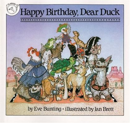 Cheery little duck lives in the desert. It's his birthday and all his animal friends give him a swimming suit, a sunhat, a scuba mask and other water gear. Finally the tardy Tortoise arrives with the inflatable swimming pool. Full-color illustrations.