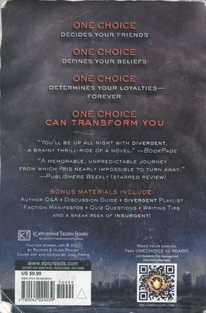 In Beatrice Prior's dystopian Chicago world, society is divided into five factions, each dedicated to the cultivation of a particular virtue—Candor (the honest), Abnegation (the selfless), Dauntless (the brave), Amity (the peaceful), and Erudite (the intelligent). On an appointed day of every year, all sixteen-year-olds must select the faction to which they will devote the rest of their lives. For Beatrice, the decision is between staying with her family and being who she really is—she can't have both. So she makes a choice that surprises everyone, including herself.