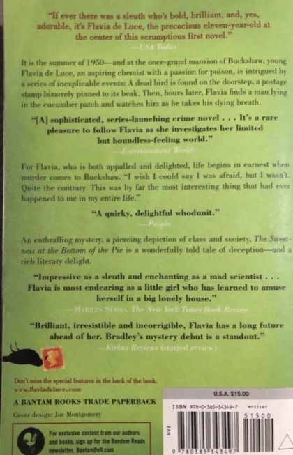 WINNER OF THE AGATHA • ARTHUR ELLIS • DILYS • DEBUT DAGGER AWARDS “Wonderfully entertaining . . . sure to be one of the most loved mysteries of the year . . . [Flavia is] a delightful, intrepid, acid-tongued new heroine.”—Chicago Sun-TimesIt is the summer of 1950–and at the once-grand mansion of Buckshaw, young Flavia de Luce, an aspiring chemist with a passion for poison, is intrigued by a series of inexplicable events: A dead bird is found on the doorstep, a postage stamp bizarrely pinned to its beak. Then, hours later, Flavia finds a man lying in the cucumber patch and watches him as he takes his dying breath.For Flavia, who is both appalled and delighted, life begins in earnest when murder comes to Buckshaw. “I wish I could say I was afraid, but I wasn’t. Quite the contrary. This was by far the most interesting thing that had ever happened to me in my entire life.” BONUS: This edition contains a The Sweetness at the Bottom of the Pie discussion guide and an excerpt from Alan Bradley's The Weed That Strings the Hangman's Bag.