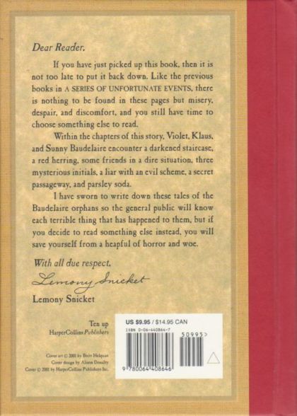 NOW A NETFLIX ORIGINAL SERIESIn their most daring misadventure, the Baudelaire orphans are adopted by very, very rich people, whose penthouse apartment is located mysteriously close to the place where all their misfortune began. Even though their new home in the city is fancy, and the children are clever and charming, I'm sorry to say that still, the unlucky orphans will encounter more disaster and woe.In fact, in this sixth book in A Series of Unfortunate Events, the children will experience a darkened staircase, a red herring, an auction, parsley soda, some friends in a dire situation, a secret passageway, and pinstripe suits.Both literary and irreverent, hilarious and deftly crafted, A Series of Unfortunate Events offers an exquisitely dark comedy in the tradition of Edward Gorey and Roald Dahl. Lemon Snicket's uproariously unhappy books continue to win readers, despite all his warnings.