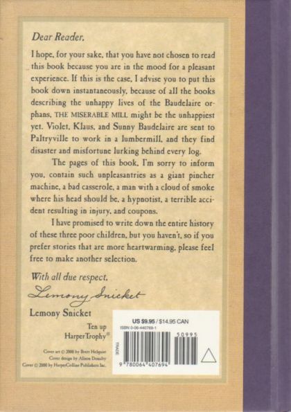 NOW A NETFLIX ORIGINAL SERIESI hope, for your sake, that you have not chosen to read this book because you are in the mood for a pleasant experience. If this is the case, I advise you to put this book down instantaneously, because of all the books describing the unhappy lives of the Baudelaire orphans, The Miserable Mill might be the unhappiest yet. Violet, Klaus, and Sunny Baudelaire are sent to Paltryville to work in a lumber mill, and they find disaster and misfortune lurking behind every log. The pages of this book, I'm sorry to inform you, contain such unpleasantries as a giant pincher machine, a bad casserole, a man with a cloud of smoke where his head should be, a hypnotist, a terrible accident resulting in injury, and coupons. I have promised to write down the entire history of these three poor children, but you haven't, so if you prefer stories that are more heartwarming, please feel free to make another selection.With all due respect,Lemony Snicket