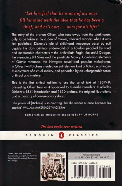 A gripping portrayal of London's dark criminal underbelly, this classic novel is scathing in its indictment of a cruel society and pervaded by an unforgettable sense of threat and mystery.The story of Oliver Twist—orphaned, and set upon by evil and adversity from his first breath—shocked readers when it was published. After running away from the workhouse and pompous beadle Mr Bumble, Oliver finds himself lured into a den of thieves peopled by vivid and memorable characters—the Artful Dodger, vicious burglar Bill Sikes, his dog Bull's Eye, and prostitute Nancy, all watched over by cunning master-thief Fagin. With Oliver Twist, Charles Dickens created an entirely new kind of fiction, scathing in its indictment of a cruel society, and pervaded by an unforgettable sense of threat and mystery.This Penguin Classics edition is the first critical edition to faithfully reproduce the text as its earliest readers would have encountered it from its serialization in Bentley's Miscellany. It includes an introduction by Philip Horne, a glossary of Victorian thieves' slang, a chronology of Dickens's life, a map of contemporary London and all of George Cruikshank's original illustrations.Penguin Classics is the leading publisher of classic literature in the English-speaking world, representing a global bookshelf of the best works throughout history and across genres and disciplines. Readers trust the series to provide authoritative texts enhanced by introductions and notes by distinguished scholars and contemporary authors, as well as up-to-date translations by award-winning translators.